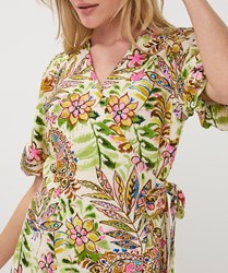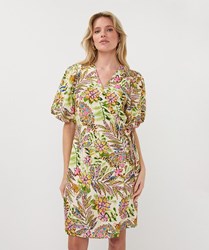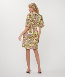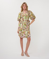 Overslag jurk in onze Jungle print. De jurk heeft ene strikceintuur in de taille, pofmouwen en is gemaakt van 85% viscose en 15% nylon met een voering van 100% viscose.