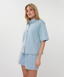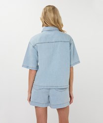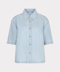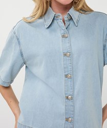 Boxy denim blouse met halve mouwen, reverskraag en mooie met strass stenen ingelegde knopen. De blouse staat leuk in combinatie met de bijpassende shorts en is gemaakt van 100% katoen.