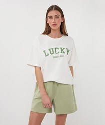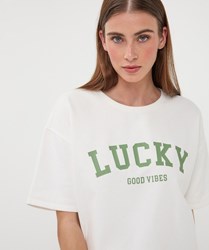 Wijdvallende top met 2 verschillende opdrukken gemaakt van 85% katoen en 15% polyester.